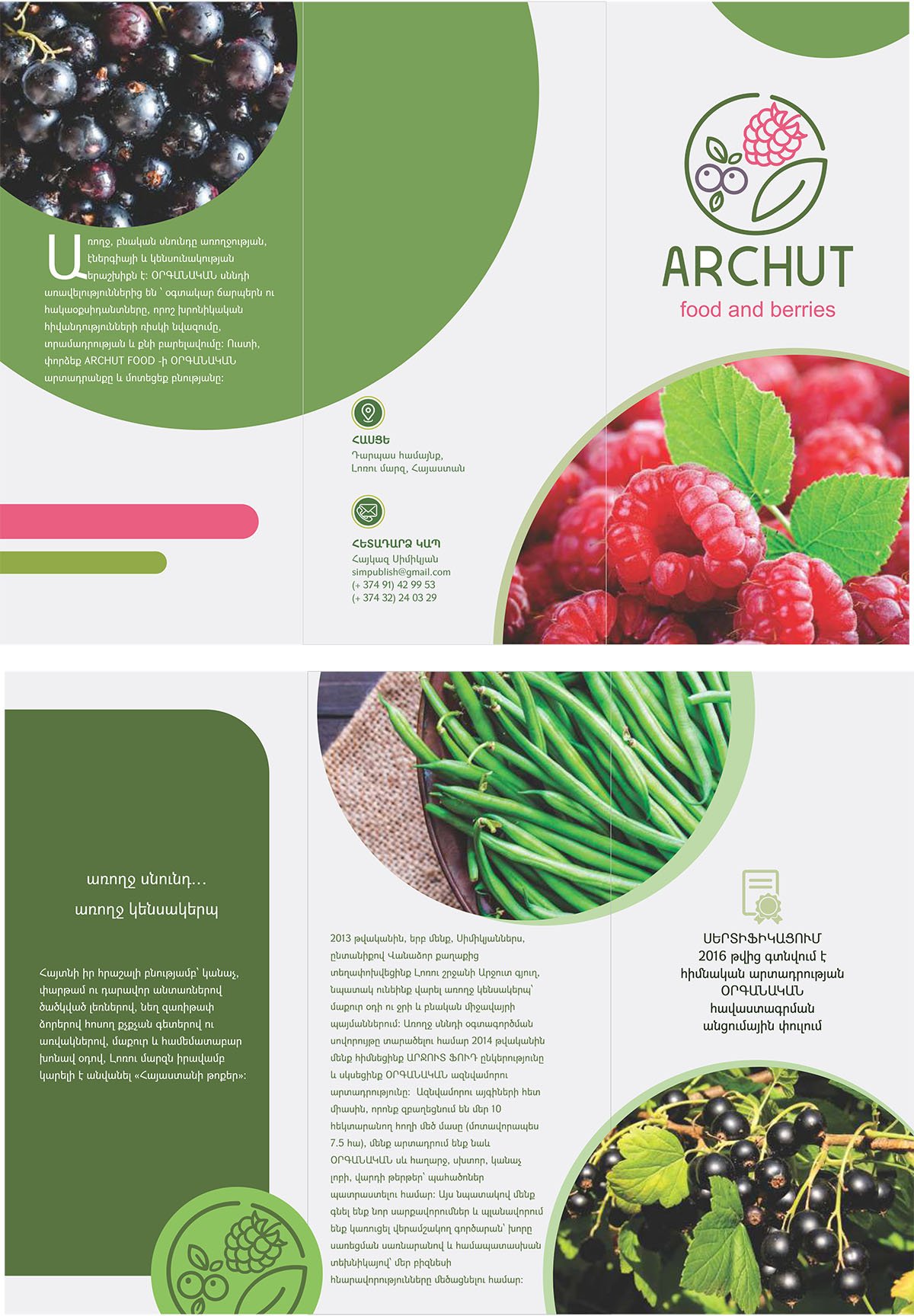| Ընկերության պատմությունը, տեսլականը, առաքելությունը | Արտադրությունն սկսվել է 2013թ.-ից՝ Սիմիկյան ընտանիքի կողմից, Լոռու մարզի Արջուտ գյուղում, իսկ ընկերությունը հիմնվել է 2014թ.-ին: Ընկերության կարգախոսն է՝ «Առողջ սնունդ… առողջ կենսակերպ»: Ընկերությանը պատկանող հողատարածքը 10 հա է, որի շուրջ 7,5 հա օգտագործվում է ազնվամորու աճեցման համար: |